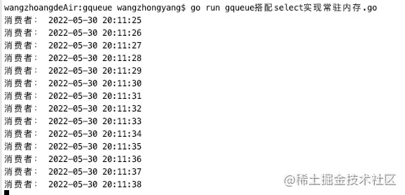 如下图所示,select{}可以阻止进程销毁,gtimer一直在生产数据,而for循环中的select一直在消费数据。