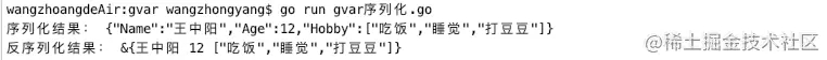 fmt.Println("序列化结果:", string(res)) //序列化结果:{"Name":"王中阳","Age":12,"Hobby":["吃饭","睡觉","打豆豆"]}