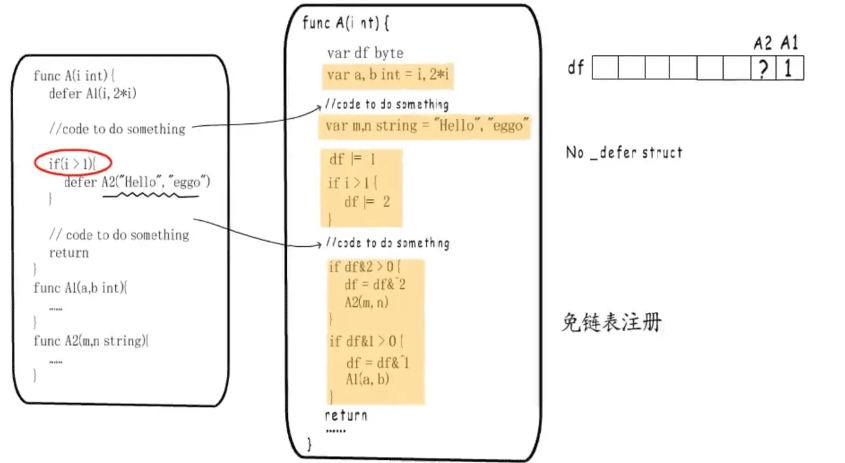 在defer出现的地方插入了指令CALL runtime.deferproc,在函数返回的地方插入了CALL runtime.deferreturn。goroutine的控制结构中,有一张表记录defer,调用runtime.deferproc时会将需要defer的表达式记录在表中,而在调用runtime.deferreturn的时候,则会依次从defer表中“出栈”并执行