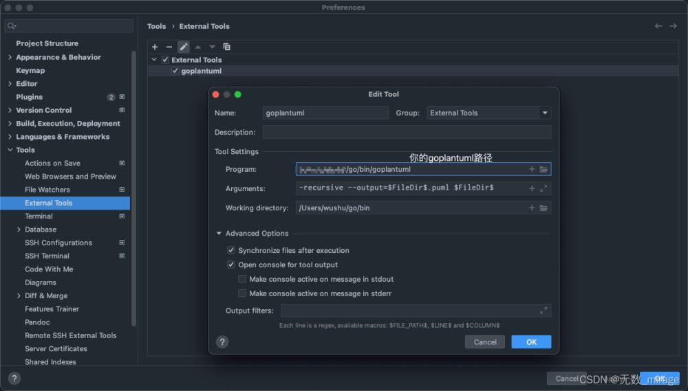 打开settings/Tools/External Tools,添加goplantuml (如下图)