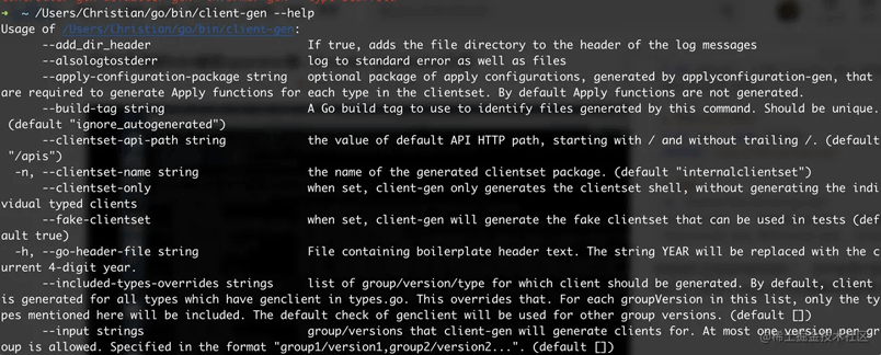 发现我们已经成功的安装了,这时候我们就可以直接使用这些工具了,比如我们可以使用--help命令来查看如何使用client-gen: