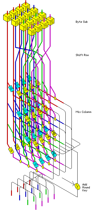 从宏观上来看AES加密过程中的一轮(根据不同的密钥长度,轮数不一样,下面会说到)如下: