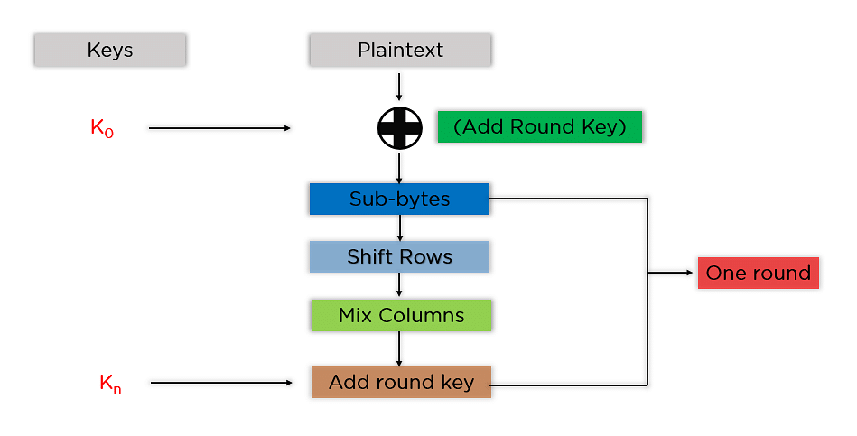 AES通过Rijndael's key schedule 将密钥被扩展为 (n+1) 个密钥,其中 n 是加密过程中要遵循的轮数。AES每个标准规定了所要加密的轮数,对于128位密钥,轮数是 10,要生成的密钥个数为 10+1,总共 11 个密钥。