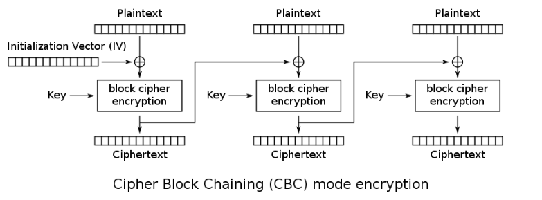 CBC加密模式如下图所示,初始向量IV和明文异或,每个块的密文作为后续块的“向量”,让每一个密文独一无二。我们待会采用这种模式。