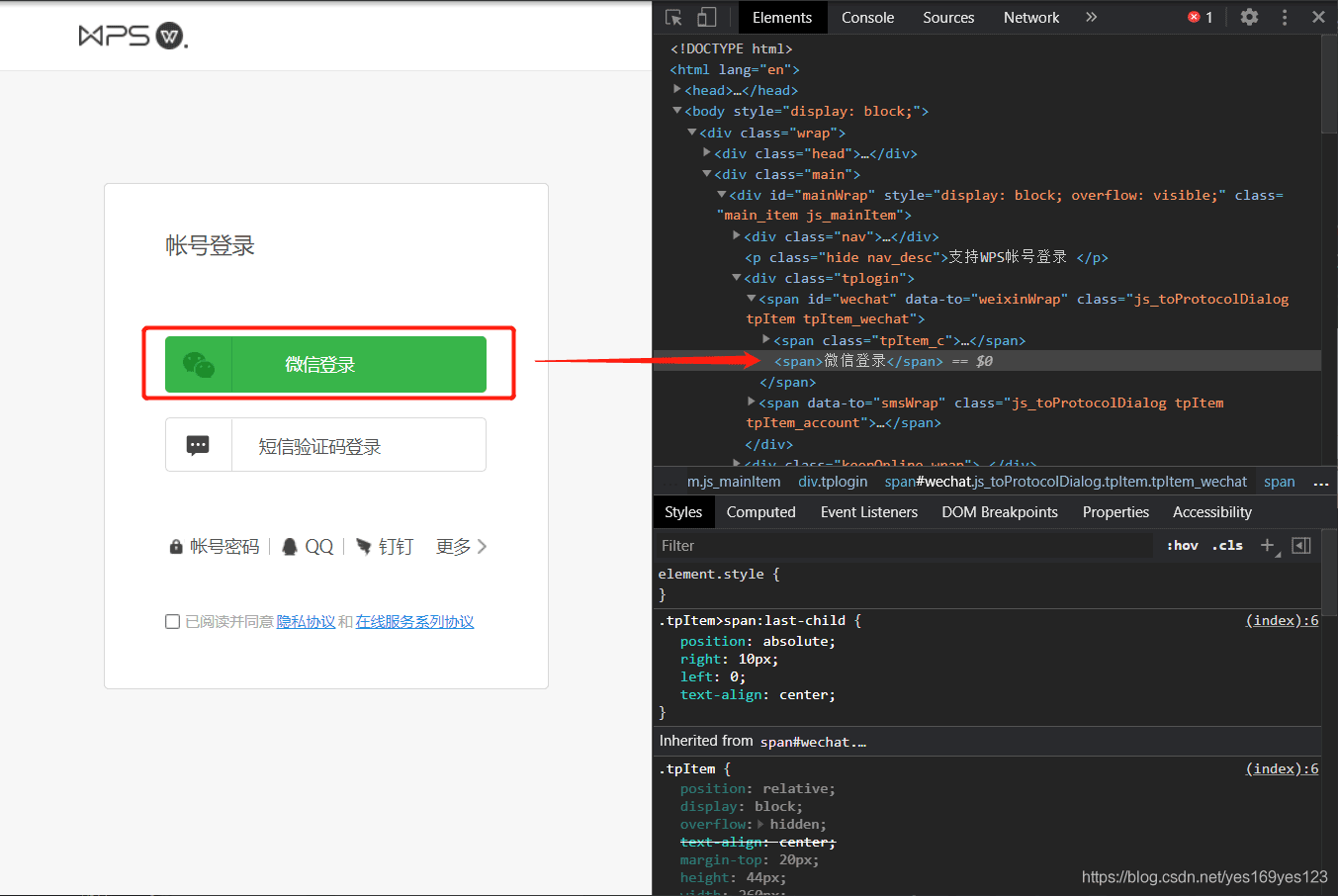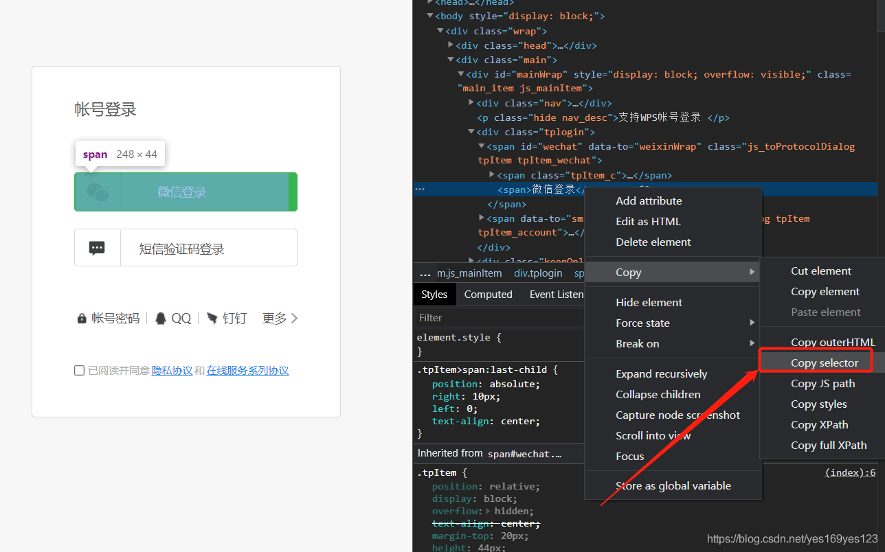 1.需要点击微信登陆按钮,先找到按钮的选择器,右键按钮并在菜单中点击检查,然后可以看到按钮的元素