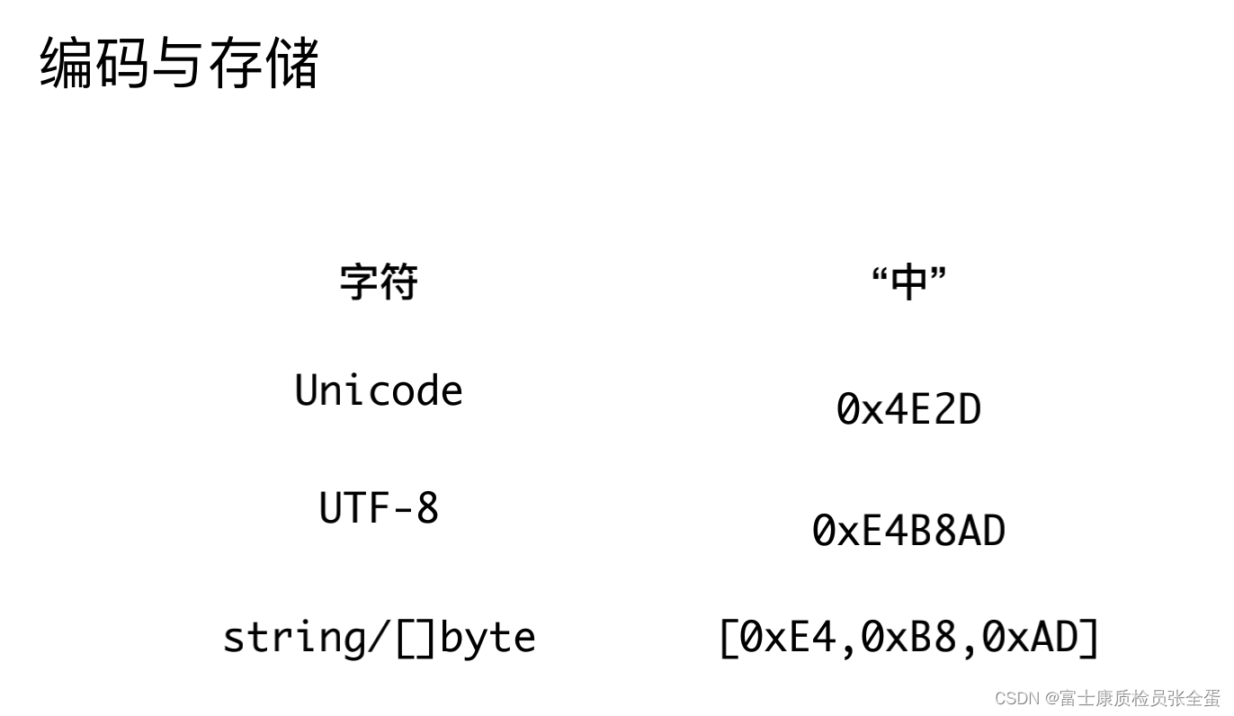 可以看到中字在字符编码集里面的编码,物理存储形式是依赖于utf8规则,被存储为0xE4B8AD,最后放在了string对应byte切片里面。分别是3个byte,每个byte放一个。