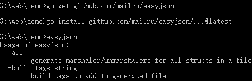 go get -u github.com/mailru/easyjson go install github.com/mailru/easyjson/easyjsonorgo go build -o easyjson github.com/mailru/easyjson/easyjson(这里默认在当前目录生成easyjson二进制可执行文件)