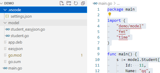 比如我的当前工作目录demo下初始化mod,创建一个文件夹model,在model下新建student.go文件: