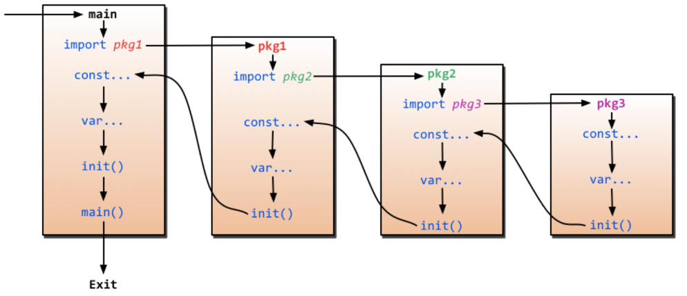 每个被导入的包在导入之后,都会先将包的可导出函数(大写字母开头)、包变量、包常量等声明并初始化完成,然后如果这个包中定义了init()函数,则自动调用init()函数。init()函数调用完成后,才回到导入者所在的包。同理,这个导入者所在包也一样的处理逻辑,声明并初始化包变量、包常量等,再调用init()函数(如果有的话),依次类推,直到回到main包,main包也将初始化包常量、包变量、函数,然后调用init()函数,调用完init()后,调用main函数,于是开始进入主程序的执行逻辑。