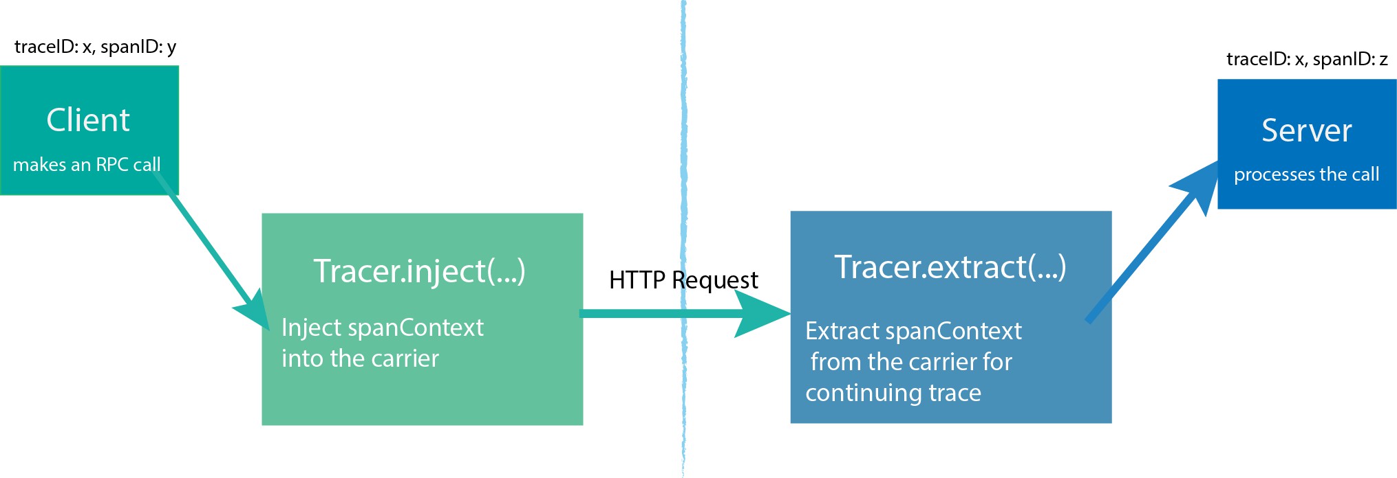 而 远程请求中传递的是 SpanContext,传递后,远程服务也创建新的 tracer,然后从 SpanContext 生成 span 依赖关系。