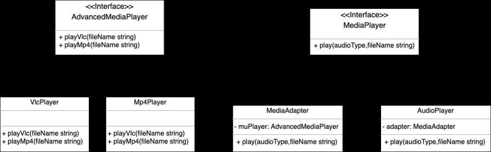 3、引入了一个 MediaAdapter ,通过适配器来处理不支持的功能,对于 AudioPlayer 来讲,它只用需要调用 MediaAdapter 就能实现各种播放格式音频的播放;