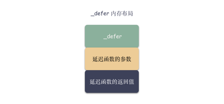 - _defer 对应一个注册的延迟回调函数(defer),defer 函数的参数和返回值紧跟 _defer,可以理解成 header,_defer 和函数参数,返回值所在内存是一块连续的空间,其中 _defer.siz 指明参数和返回值的所占空间大小;