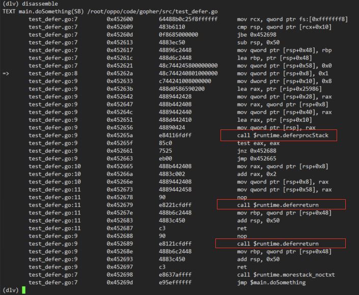 从汇编指令我们看到,编译器在遇到 defer 关键字的时候,添加了一些运行库函数:deferprocStack和deferreturn。