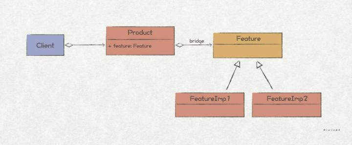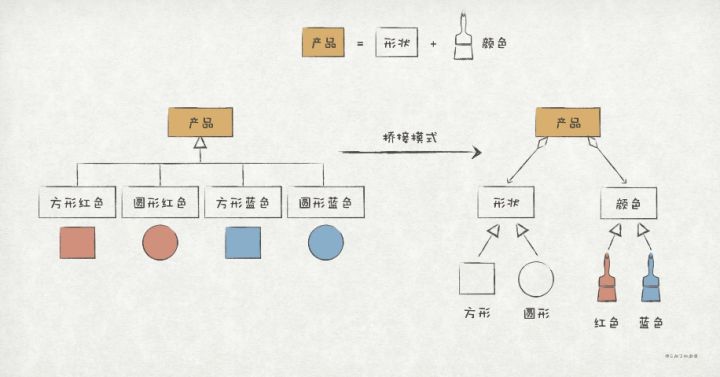桥接模式主要用于将抽象部分和实现部分进行解耦,使得它们能够各自往独立的方向变化。它解决了在模块有多种变化方向的情况下,用继承所导致的类爆炸问题。举一个例子,一个产品有形状和颜色两个特征(变化方向),其中形状分为方形和圆形,颜色分为红色和蓝色。如果采用继承的设计方案,那么就需要新增4个产品子类:方形红色、圆形红色、方形蓝色、圆形红色。如果形状总共有m种变化,颜色有n种变化,那么就需要新增m*n个产品子类!现在我们使用桥接模式进行优化,将形状和颜色分别设计为一个抽象接口独立出来,这样需要新增2个形状子类:方形和圆形,以及2个颜色子类:红色和蓝色。同样,如果形状总共有m种变化,颜色有n种变化,总共只需要新增m+n个子类!