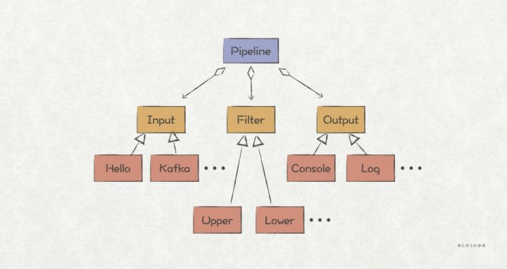 一个Pipeline由Input、Filter、Output三类插件组成,形成了“部分-整体”的关系,而且它们都实现了Plugin接口,这就是一个典型的组合模式的实现。Client无需显式地启动和停止Input、Filter和Output插件,在调用Pipeline对象的Start和Stop方法时,Pipeline就已经帮你按顺序完成对应插件的启动和停止。