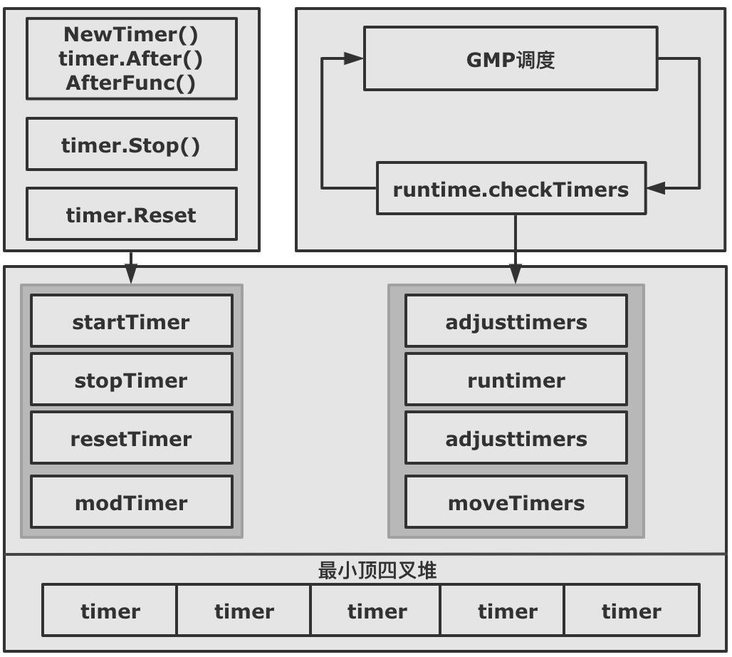 GMP 在调度周期内中会调用 checkTimers ,遍历该 P 的 timer 堆上的元素,根据对应 timer 的状态执行真的操作。