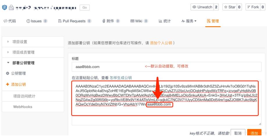 相对账户设置,大家比较熟悉,这里简单描述一下项目的公钥设置。登录平台->选择项目->进入“管理”->点击左侧的“公钥管理”->点击“添加部署公钥”,将刚刚生成的公钥填写到“公钥”栏,并为它起一个名称,保存即可。