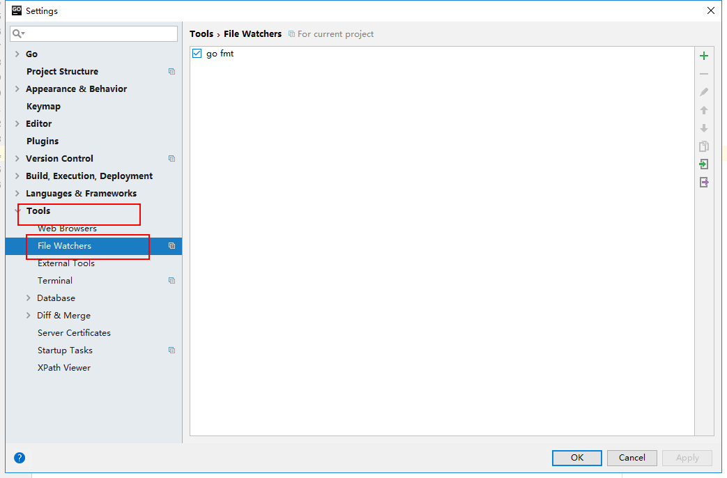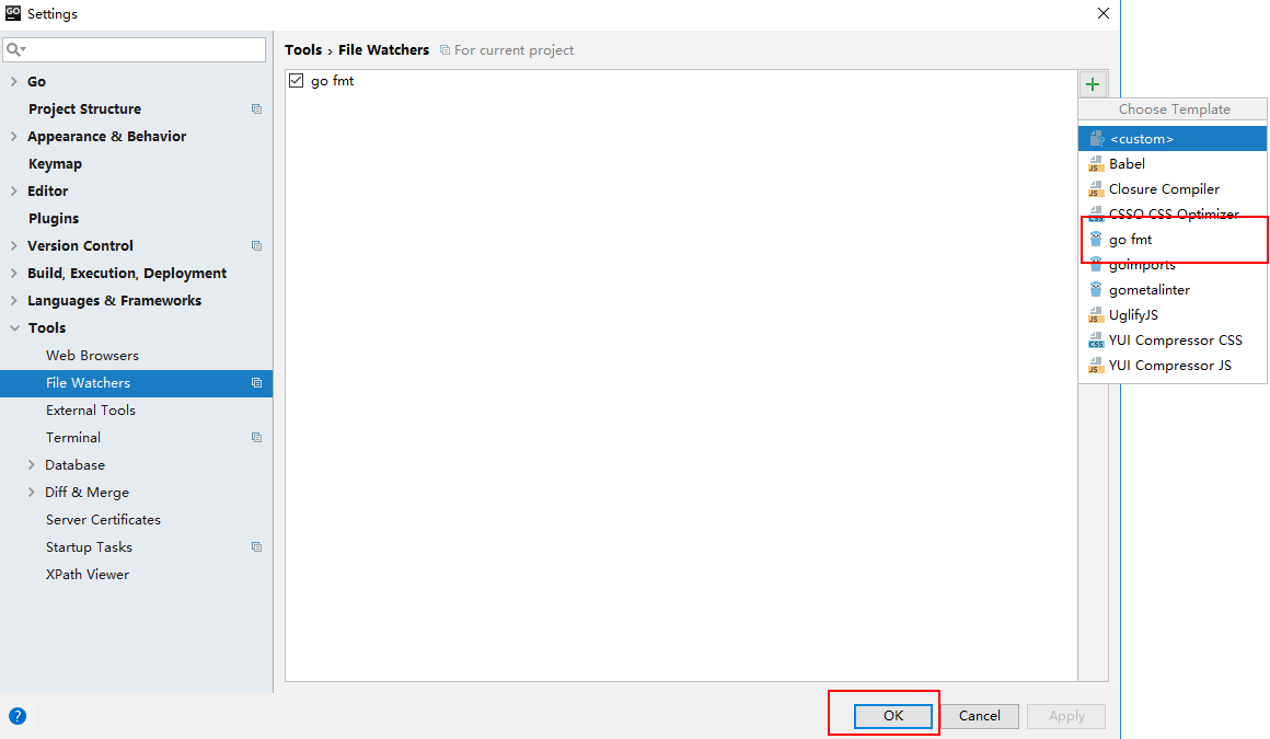 goland->Preferences->搜索框内输入 file watchers->选择File Watchers->点击右边的左下角的 + 号->选择go fmt 模板->弹出设置框,默认选项->点击确定->确定