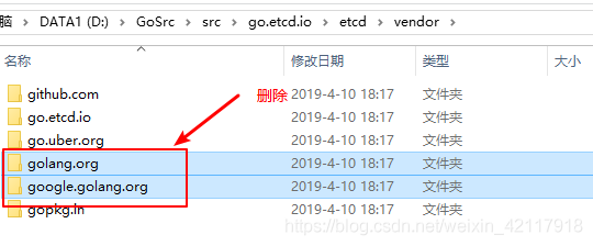 说明golang.org/x/net/包下的 trace 与go.etcd.io/etcd/vendor/golang.org/x/net/ 包下trace有冲突,解决方法:找到go.etcd.io\etcd\vendor目录: