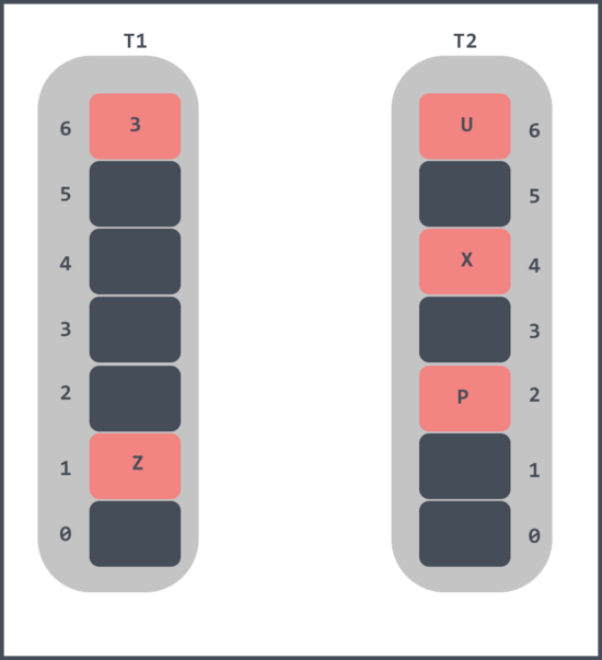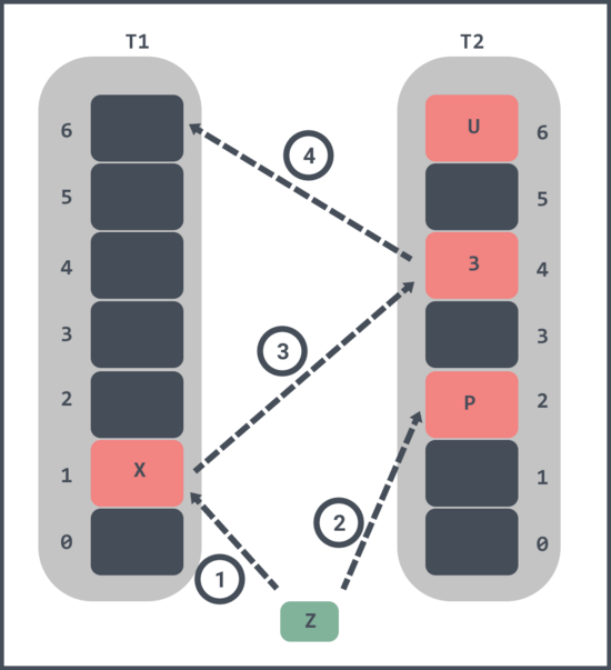 - 随机将 T1 中的槽位1中的元素 X 踢出,X 的 T2 对应的槽位4已经被元素 3 占了;