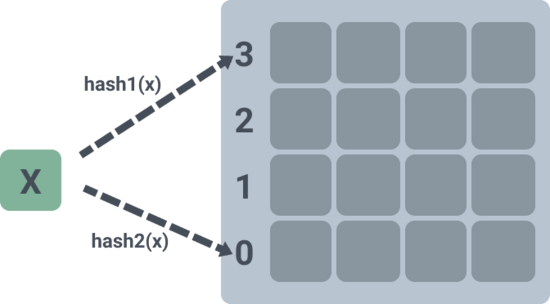 f = fingerprint(x); i1 = hash(x); i2 = i1 ⊕ hash( f);