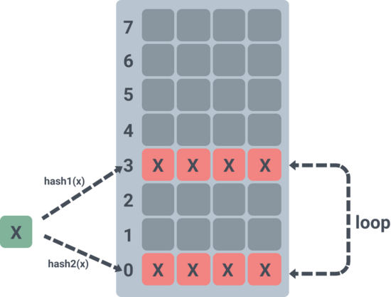 - 被踢出的元素会循环的去找自己的另一个位置,如果被暂了也会随机选择一个将其踢出,被踢出的元素又会循环找位置;