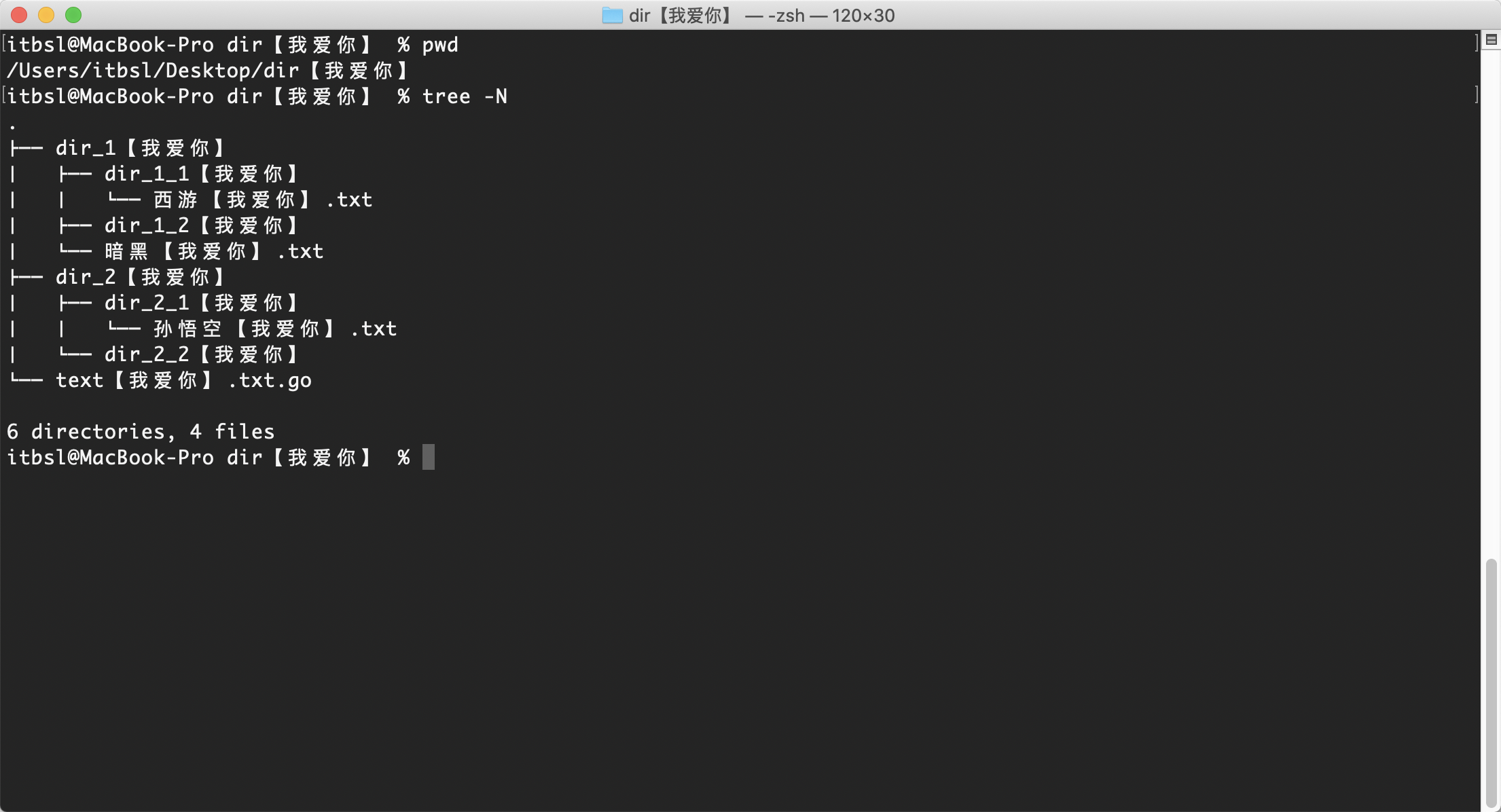 如下图,我的桌面有一个名为dir【我爱你】的目录,而且这个目录下的子目录和文件都包含【我爱你】,这个【我爱你】对于我们来说是完全无用的,我们可以用Go的文件操作库来递归对文件进行重命名,把不需要的名字替换为空