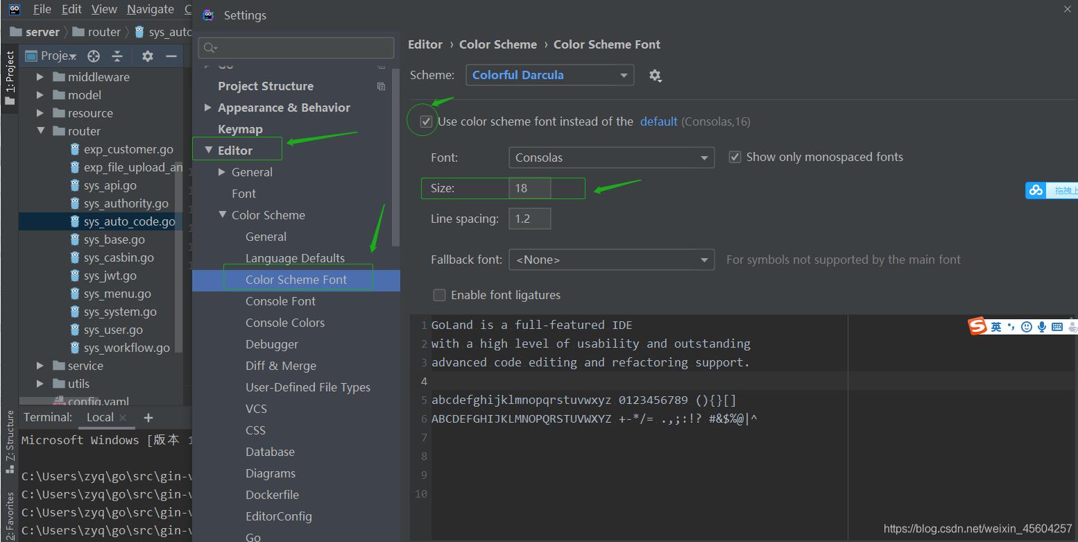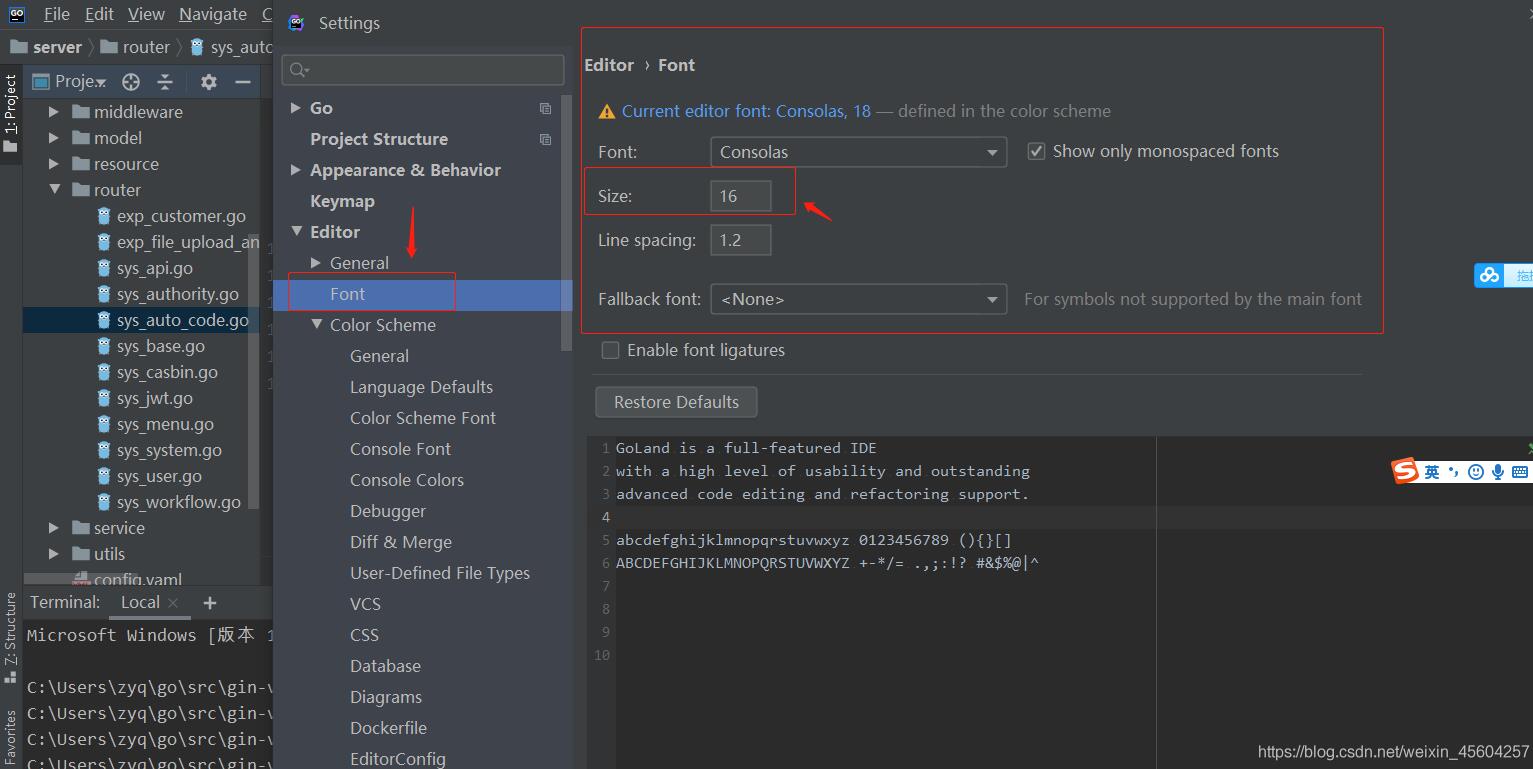 Goland调节字体大小的设置(编辑区,terminal区,页面字体)