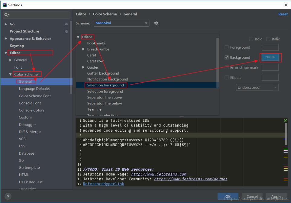 设置的路径在 Editor > Color Scheme > General > Editor > Selection background 下面以2018版的Goland为例,如图: