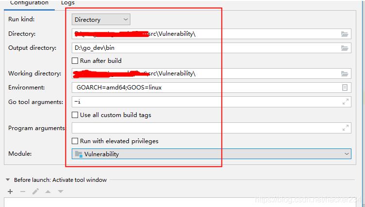 Output directory设置与go build -o 不相容,所以不用设置,我们使用-o参数来控制可执行文件的路径以及名字