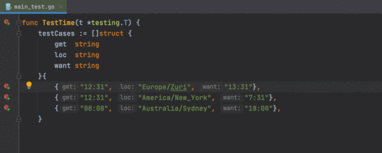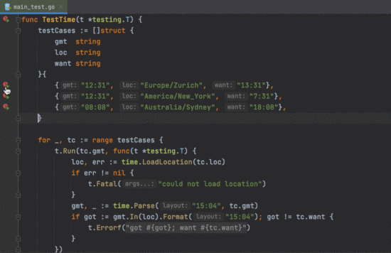 - 测试数据变量必须是切片,数组或 map。它必须在与调用相同的函数中定义,并且在初始化后不得修改(for 循环中的 range 子句除外)。