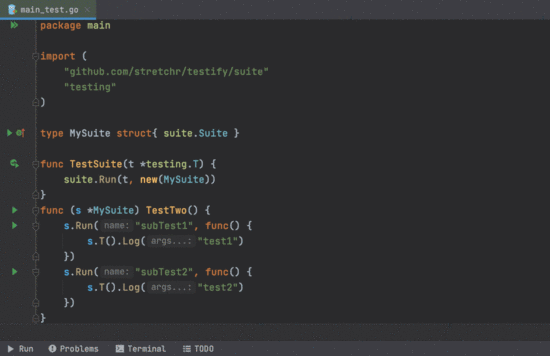 现在,IDE 可以识别启动测试套件的测试功能,并提供一种启动单个 suite.Run 和 suite.T().Run,只要子测试名称是字符串常量即可。另外,可以从“Run”工具窗口重新运行子测试,以避免重新运行整个顶级测试。