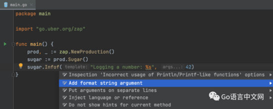 不正确使用类似 Println/Printf 的函数,GoLand 会有警告,之前只对标准库起作用,现在支持 github.com/pkg/errors, github.com/sirupsen/logrus 和 go.uber.org/zap 包。