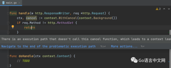 context.CancelFunc(不称为代码检查)报告了 context 取消的潜在不安全使用。当 context 返回的 “cancel” 函数未在所有执行路径上调用时,此功能特别有用。