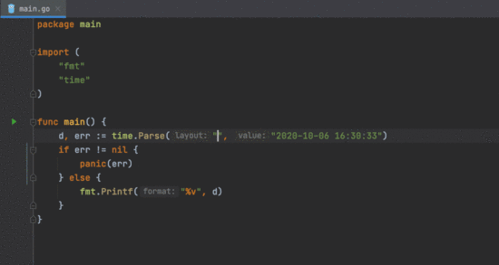 我们增加了对 time 包的支持,因此您可以更轻松地使用 time 和 duration。GoLand 将通过代码补全(⌃Space)建议使用 ISO-8601 中 YYYY,MM,DD 占位符的预定义 Layout。