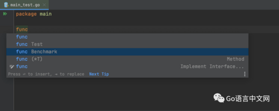 在测试文件中键入 func 时,默认情况下,GoLand 会提示出 bench 和 test 函数模板。