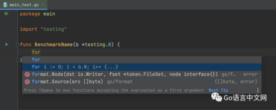 当您在基准测试中输入 for 时,IDE 建议使用 b.N 的 for 循环来完成它。