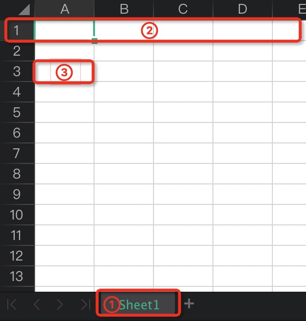 为了方便开源库的快速上手,我们先来了解 excel 中的几个关键术语,如下图所示,①为sheet,也就是表格中的页签;②为row,代表 excel 中的一行;③为cell,代表 excel 中的一个单元格。