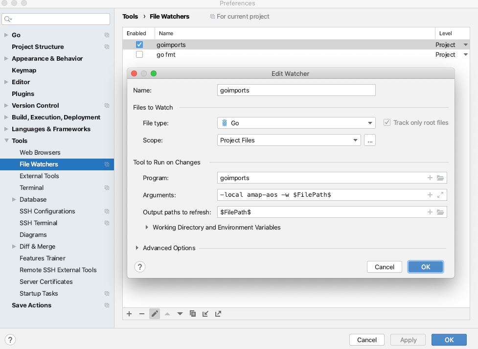 2.设置goimports 格式化代码。Preferences -> Tools -> File Watchers。添加goimports 然后设置本地包单独分组参数。