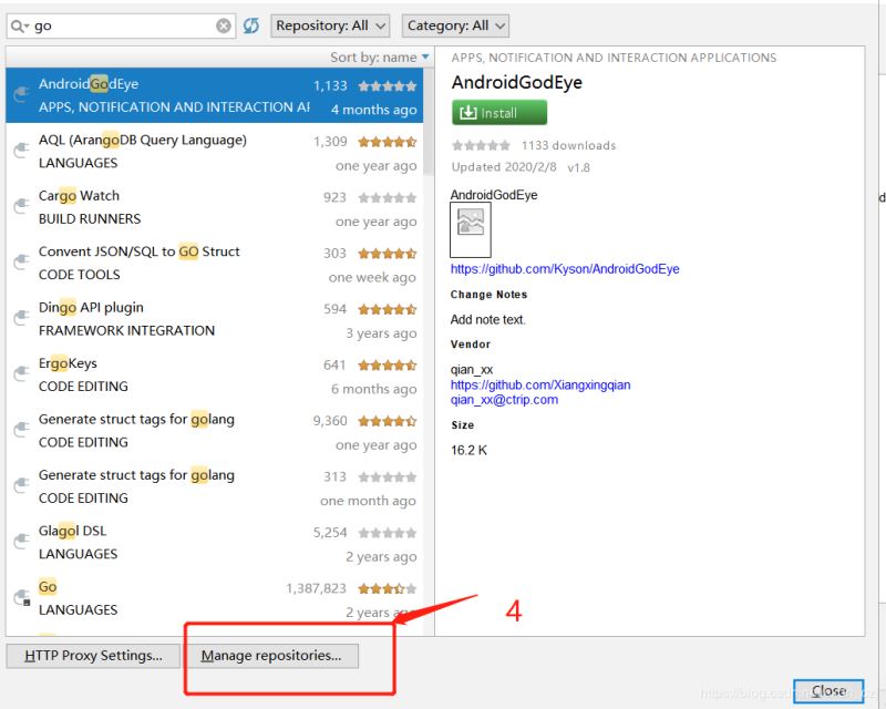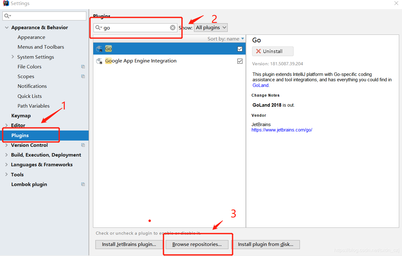 file->plugins->在搜索框搜索go 插件 前两步可能收不到 往下看