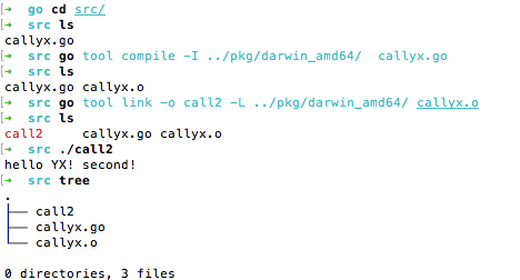 ➜ src go tool compile -I ../pkg/darwin_amd64/ callyx.go ➜ src go tool link -o call2 -L ../pkg/darwin_amd64/ callyx.o