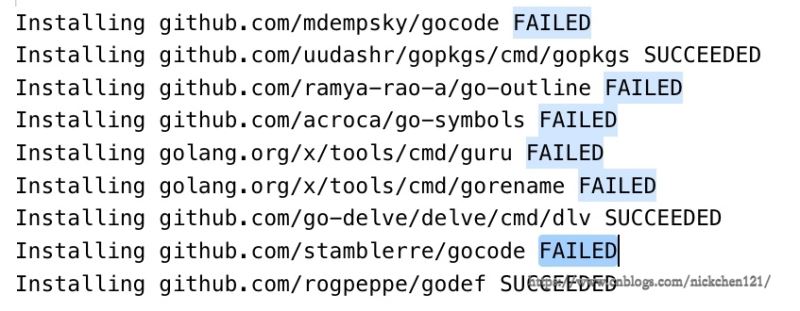 VS Code此时会下载并安装上图列出来的16个工具,但是由于国内的网络环境基本上都会出现安装失败,如下图各种FAILED: