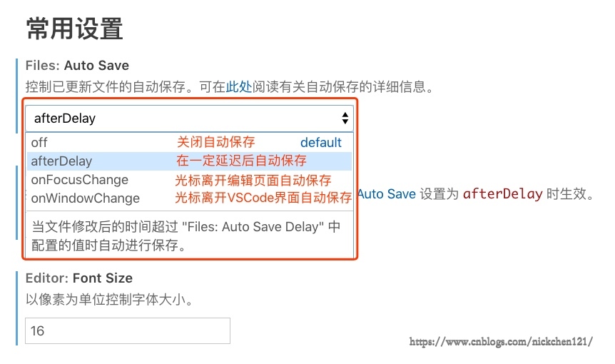 依次点击 首选项->设置,打开设置页面就能看到自动保存相关配置如图,可以根据自己的喜好选择自动保存的方式: