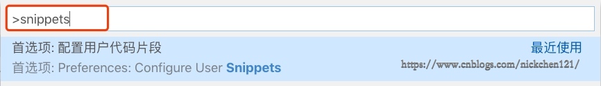 还是按Ctrl/Command+Shift+P,按下图输入>snippets,选择命令并执行: