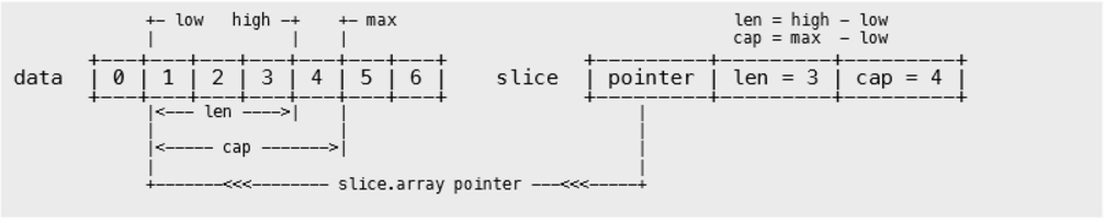 上面代码中创建了一个长度为7的数组arr,同时创建一个基于数组arr的切片slice1,切片引用了数组的index=1到index=3之间的元素,同时也允许切片最大扩张1个元素大小的空间。如果这个扩张空间大于7那么程序就会panic。最后创建了一个基于slice1延申的一个切片slice2,它引用了切片的index=1到index=3之间的元素,由于slice1最大扩容1个元素,因此slice2也最多扩容一个元素,超过了会panic。