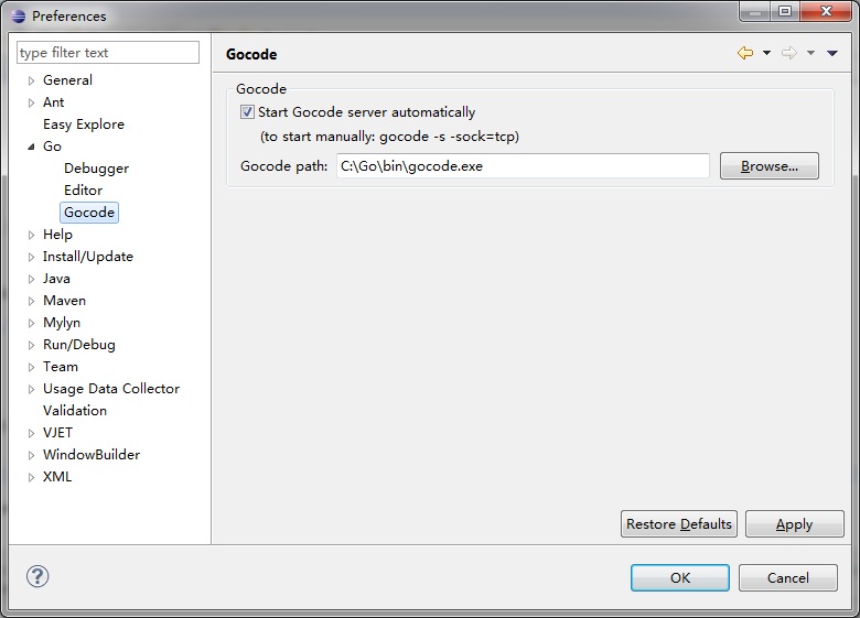 (2).配置gocode(可选),这里我用的是eclipse插件自带的gocode。