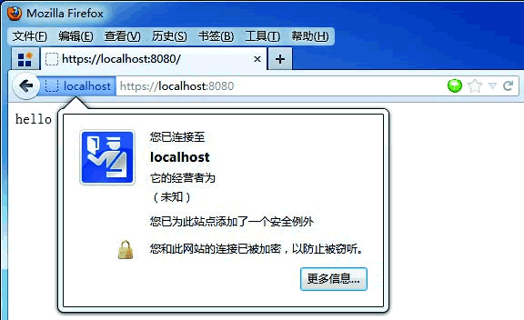 Go语言目前实现了 TLS 协议的部分功能,已经可以提供最基础的安全层服务。下面我们来看一下如何实现支持 TLS 的 Web 服务器。下面的代码示范了如何使用 http.ListenAndServerTLS 实现一个支持 HTTPS 的 Web 服务器。package mainimport ( "fmt" "net/http")const SERVER_PORT = 8080const SERVER_DOMAIN = "localhost"const RESPONSE_TEMPLATE = "hello"func rootHandler(w http.ResponseWriter, req *http.Request) { w.Header().Set("Content-Type", "text/html") w.Header().Set("Content-Length", fmt.Sprint(len(RESPONSE_TEMPLATE))) w.Write([]byte(RESPONSE_TEMPLATE))}func main() { http.HandleFunc(fmt.Sprintf("%s:%d/", SERVER_DOMAIN, SERVER_PORT), rootHandler) http.ListenAndServeTLS(fmt.Sprintf(":%d", SERVER_PORT), "rui.crt", "rui.key", nil)}运行该服务器后,我们可以在浏览器中访问 localhost:8080 并查看访问效果,如下图所示。