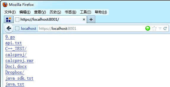 利用 Go语言标准库中提供的完备封装,我们也可以很容易实现一个支持 HTTPS 的文件服务器,代码如下所示。package mainimport ( "net/http")func main(){ h := http.FileServer(http.Dir(".")) http.ListenAndServeTLS(":8001", "rui.crt", "rui.key", h)}运行效果如下图所示。