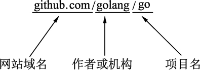 Go语言的代码被托管于 Github.com 网站,该网站是基于 Git 代码管理工具的,很多有名的项目都在该网站托管代码。其他类似的托管网站还有 code.google.com、bitbucket.org 等。这些网站的项目包路径都有一个共同的标准,参见下图所示。